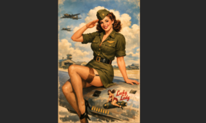 Get your free military vintage pin up girl download inspired by classic WWII nose art and retro army artwork. This high-resolution vintage pin-up illustration features bold colors, patriotic styling, and authentic 1940s military aesthetics.